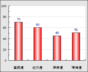 成功運 目的に対する成功運の強さをあらわします。この点数が高いほど自分の思い通りに成功し、逆に悪いと逆境・批判・障害などに苦心します。 60点