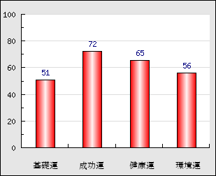成功運 目的に対する成功運の強さをあらわします。この点数が高いほど自分の思い通りに成功し、逆に悪いと逆境・批判・障害などに苦心します。 72点