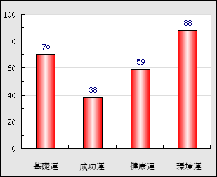 成功運 目的に対する成功運の強さをあらわします。この点数が高いほど自分の思い通りに成功し、逆に悪いと逆境・批判・障害などに苦心します。 38点