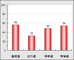 環境運 家庭や職場等での援助運・環境運を司ります。これが良いと配偶者や子供・職場の同僚などから助力が得られやすく、悪いと波乱・不和・孤独などがあります。 54点