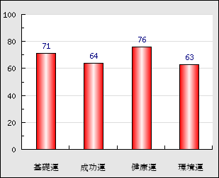 環境運 家庭や職場等での援助運・環境運を司ります。これが良いと配偶者や子供・職場の同僚などから助力が得られやすく、悪いと波乱・不和・孤独などがあります。 63点