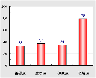 環境運 家庭や職場等での援助運・環境運を司ります。これが良いと配偶者や子供・職場の同僚などから助力が得られやすく、悪いと波乱・不和・孤独などがあります。 79点