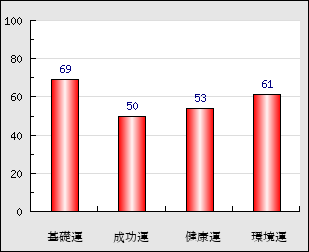 成功運 目的に対する成功運の強さをあらわします。この点数が高いほど自分の思い通りに成功し、逆に悪いと逆境・批判・障害などに苦心します。 50点