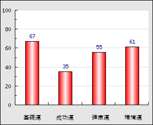 成功運 目的に対する成功運の強さをあらわします。この点数が高いほど自分の思い通りに成功し、逆に悪いと逆境・批判・障害などに苦心します。 35点