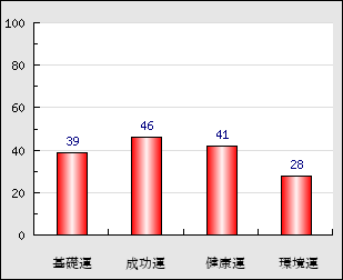 成功運 目的に対する成功運の強さをあらわします。この点数が高いほど自分の思い通りに成功し、逆に悪いと逆境・批判・障害などに苦心します。 46点