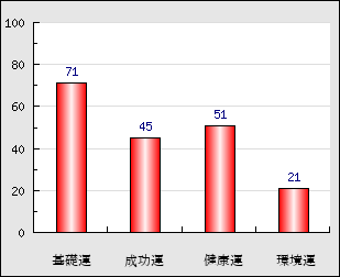 成功運 目的に対する成功運の強さをあらわします。この点数が高いほど自分の思い通りに成功し、逆に悪いと逆境・批判・障害などに苦心します。 45点
