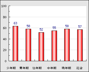 ※年代別運勢グラフは、あくまでも時期別の運勢を概算したものですので参考程度にご覧ください。少年期や青年期の運勢が平均と比べて高い場合は比較的若い頃に成功や幸福があり、反対に中年期や晩年期の運勢が平均と比べて高い場合は後年に華開く大器晩成型と言えるでしょう。ただし、少年期の運勢が低いからと言って、若い頃は成功しないといったことではありません。