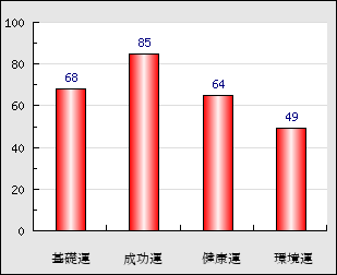 環境運 家庭や職場等での援助運・環境運を司ります。これが良いと配偶者や子供・職場の同僚などから助力が得られやすく、悪いと波乱・不和・孤独などがあります。 49点