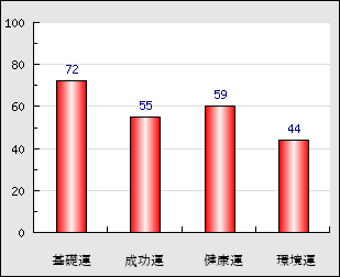 成功運 目的に対する成功運の強さをあらわします。この点数が高いほど自分の思い通りに成功し、逆に悪いと逆境・批判・障害などに苦心します。 55点