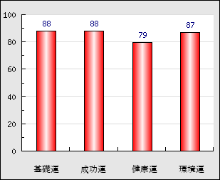 環境運 家庭や職場等での援助運・環境運を司ります。これが良いと配偶者や子供・職場の同僚などから助力が得られやすく、悪いと波乱・不和・孤独などがあります。 87点