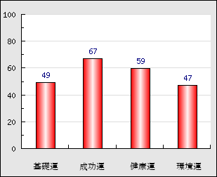 成功運 目的に対する成功運の強さをあらわします。この点数が高いほど自分の思い通りに成功し、逆に悪いと逆境・批判・障害などに苦心します。 67点