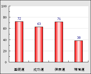 環境運 家庭や職場等での援助運・環境運を司ります。これが良いと配偶者や子供・職場の同僚などから助力が得られやすく、悪いと波乱・不和・孤独などがあります。 38点