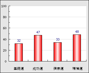 成功運 目的に対する成功運の強さをあらわします。この点数が高いほど自分の思い通りに成功し、逆に悪いと逆境・批判・障害などに苦心します。 47点