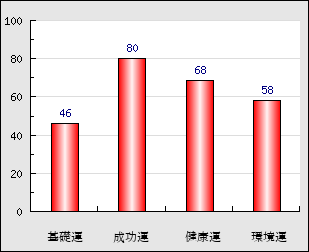 成功運 目的に対する成功運の強さをあらわします。この点数が高いほど自分の思い通りに成功し、逆に悪いと逆境・批判・障害などに苦心します。 80点