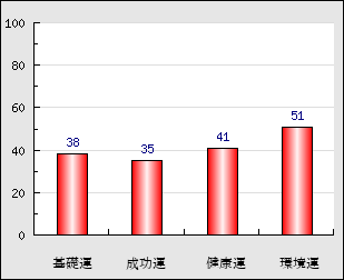 環境運 家庭や職場等での援助運・環境運を司ります。これが良いと配偶者や子供・職場の同僚などから助力が得られやすく、悪いと波乱・不和・孤独などがあります。 51点