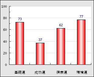 環境運 家庭や職場等での援助運・環境運を司ります。これが良いと配偶者や子供・職場の同僚などから助力が得られやすく、悪いと波乱・不和・孤独などがあります。 77点