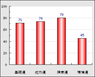 環境運 家庭や職場等での援助運・環境運を司ります。これが良いと配偶者や子供・職場の同僚などから助力が得られやすく、悪いと波乱・不和・孤独などがあります。 45点