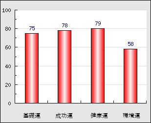 環境運 家庭や職場等での援助運・環境運を司ります。これが良いと配偶者や子供・職場の同僚などから助力が得られやすく、悪いと波乱・不和・孤独などがあります。 58点