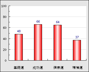 成功運 目的に対する成功運の強さをあらわします。この点数が高いほど自分の思い通りに成功し、逆に悪いと逆境・批判・障害などに苦心します。 66点