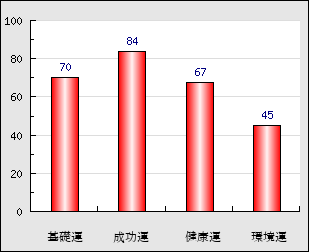 成功運 目的に対する成功運の強さをあらわします。この点数が高いほど自分の思い通りに成功し、逆に悪いと逆境・批判・障害などに苦心します。 84点
