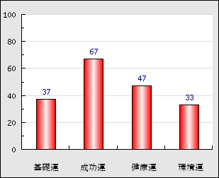 成功運 目的に対する成功運の強さをあらわします。この点数が高いほど自分の思い通りに成功し、逆に悪いと逆境・批判・障害などに苦心します。 67点