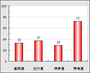 環境運 家庭や職場等での援助運・環境運を司ります。これが良いと配偶者や子供・職場の同僚などから助力が得られやすく、悪いと波乱・不和・孤独などがあります。 72点