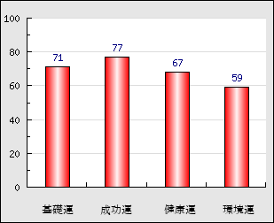 環境運 家庭や職場等での援助運・環境運を司ります。これが良いと配偶者や子供・職場の同僚などから助力が得られやすく、悪いと波乱・不和・孤独などがあります。 59点