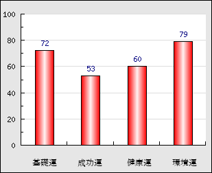 環境運 家庭や職場等での援助運・環境運を司ります。これが良いと配偶者や子供・職場の同僚などから助力が得られやすく、悪いと波乱・不和・孤独などがあります。 79点