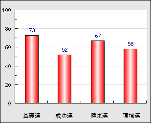 成功運 目的に対する成功運の強さをあらわします。この点数が高いほど自分の思い通りに成功し、逆に悪いと逆境・批判・障害などに苦心します。 52点