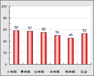 ※年代別運勢グラフは、あくまでも時期別の運勢を概算したものですので参考程度にご覧ください。少年期や青年期の運勢が平均と比べて高い場合は比較的若い頃に成功や幸福があり、反対に中年期や晩年期の運勢が平均と比べて高い場合は後年に華開く大器晩成型と言えるでしょう。ただし、少年期の運勢が低いからと言って、若い頃は成功しないといったことではありません。