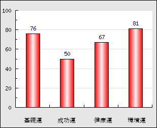 環境運 家庭や職場等での援助運・環境運を司ります。これが良いと配偶者や子供・職場の同僚などから助力が得られやすく、悪いと波乱・不和・孤独などがあります。 81点