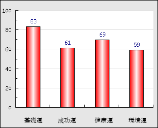 成功運 目的に対する成功運の強さをあらわします。この点数が高いほど自分の思い通りに成功し、逆に悪いと逆境・批判・障害などに苦心します。 61点