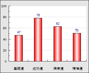 成功運 目的に対する成功運の強さをあらわします。この点数が高いほど自分の思い通りに成功し、逆に悪いと逆境・批判・障害などに苦心します。 78点