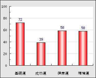 成功運 目的に対する成功運の強さをあらわします。この点数が高いほど自分の思い通りに成功し、逆に悪いと逆境・批判・障害などに苦心します。 39点