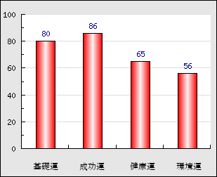 成功運 目的に対する成功運の強さをあらわします。この点数が高いほど自分の思い通りに成功し、逆に悪いと逆境・批判・障害などに苦心します。 86点