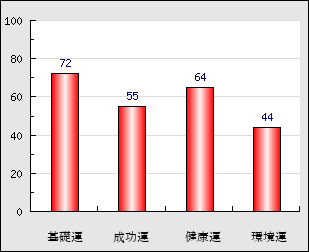 成功運 目的に対する成功運の強さをあらわします。この点数が高いほど自分の思い通りに成功し、逆に悪いと逆境・批判・障害などに苦心します。 55点