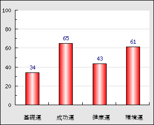 成功運 目的に対する成功運の強さをあらわします。この点数が高いほど自分の思い通りに成功し、逆に悪いと逆境・批判・障害などに苦心します。 65点