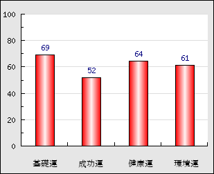 健康運 体力・健康に恵まれるか否かをあらわします。先天的に健康に恵まれても、これが悪いと次第に病弱となり、種々の病気に悩まされやすくなります。 64点