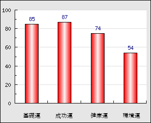 成功運 目的に対する成功運の強さをあらわします。この点数が高いほど自分の思い通りに成功し、逆に悪いと逆境・批判・障害などに苦心します。 87点