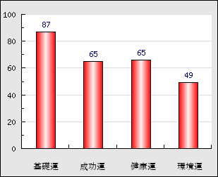 成功運 目的に対する成功運の強さをあらわします。この点数が高いほど自分の思い通りに成功し、逆に悪いと逆境・批判・障害などに苦心します。 65点