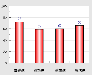 環境運 家庭や職場等での援助運・環境運を司ります。これが良いと配偶者や子供・職場の同僚などから助力が得られやすく、悪いと波乱・不和・孤独などがあります。 66点