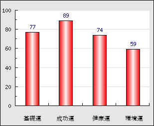 成功運 目的に対する成功運の強さをあらわします。この点数が高いほど自分の思い通りに成功し、逆に悪いと逆境・批判・障害などに苦心します。 89点