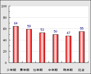 ※年代別運勢グラフは、あくまでも時期別の運勢を概算したものですので参考程度にご覧ください。少年期や青年期の運勢が平均と比べて高い場合は比較的若い頃に成功や幸福があり、反対に中年期や晩年期の運勢が平均と比べて高い場合は後年に華開く大器晩成型と言えるでしょう。ただし、少年期の運勢が低いからと言って、若い頃は成功しないといったことではありません。
