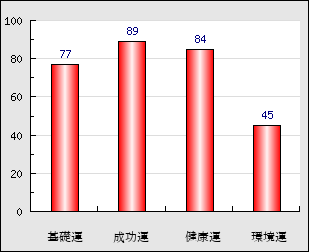 環境運 家庭や職場等での援助運・環境運を司ります。これが良いと配偶者や子供・職場の同僚などから助力が得られやすく、悪いと波乱・不和・孤独などがあります。 45点