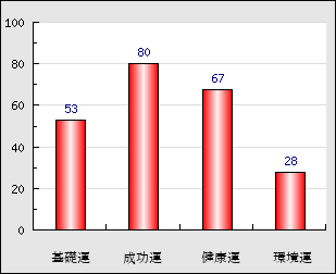 成功運 目的に対する成功運の強さをあらわします。この点数が高いほど自分の思い通りに成功し、逆に悪いと逆境・批判・障害などに苦心します。 80点