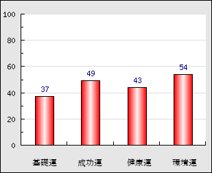 環境運 家庭や職場等での援助運・環境運を司ります。これが良いと配偶者や子供・職場の同僚などから助力が得られやすく、悪いと波乱・不和・孤独などがあります。 54点