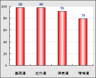 成功運 目的に対する成功運の強さをあらわします。この点数が高いほど自分の思い通りに成功し、逆に悪いと逆境・批判・障害などに苦心します。 98点