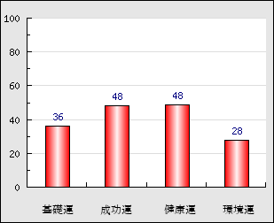 成功運 目的に対する成功運の強さをあらわします。この点数が高いほど自分の思い通りに成功し、逆に悪いと逆境・批判・障害などに苦心します。 48点