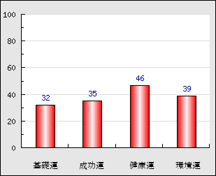 環境運 家庭や職場等での援助運・環境運を司ります。これが良いと配偶者や子供・職場の同僚などから助力が得られやすく、悪いと波乱・不和・孤独などがあります。 39点