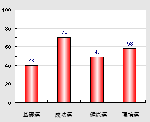 成功運 目的に対する成功運の強さをあらわします。この点数が高いほど自分の思い通りに成功し、逆に悪いと逆境・批判・障害などに苦心します。 70点
